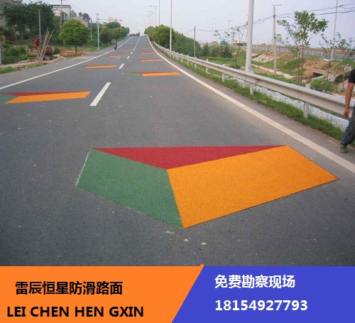 防滑涂層由黏合劑及防滑骨料組成,涂層表面可撒布玻璃微珠。成型后涂層的顏色主要為紅、綠、黃、藍(lán)。目前按施工方法來分,有熱熔型和冷涂型。